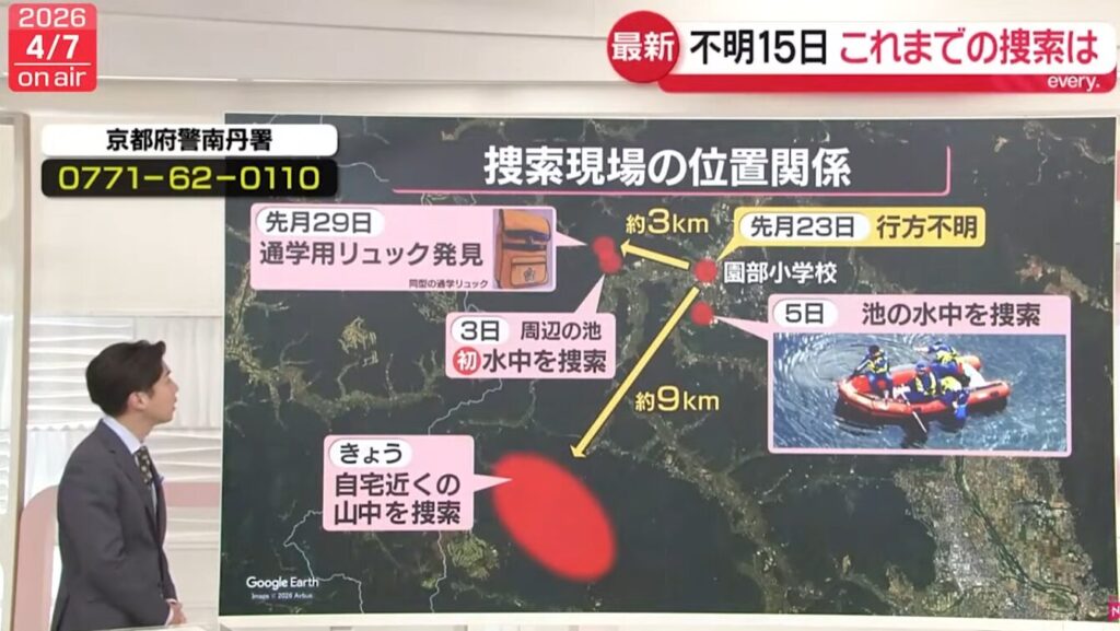 | 2026年3月23日 午前8時頃 | 父親が車で園部小学校付近まで送り届ける。以降、安達結希さん(11)の行方が不明に |